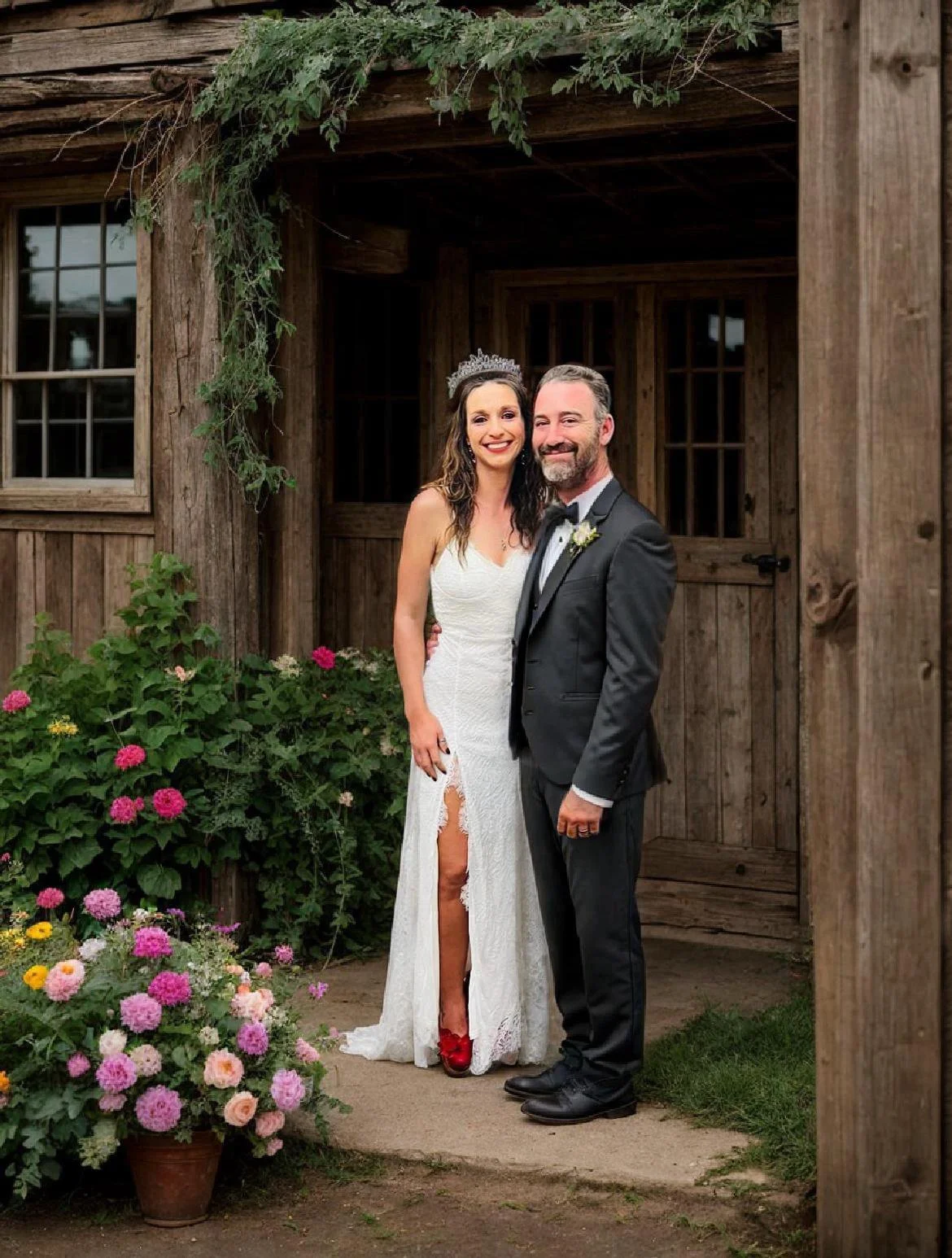 Moved couple to wedding venue added a tux to husband and crown to her head
